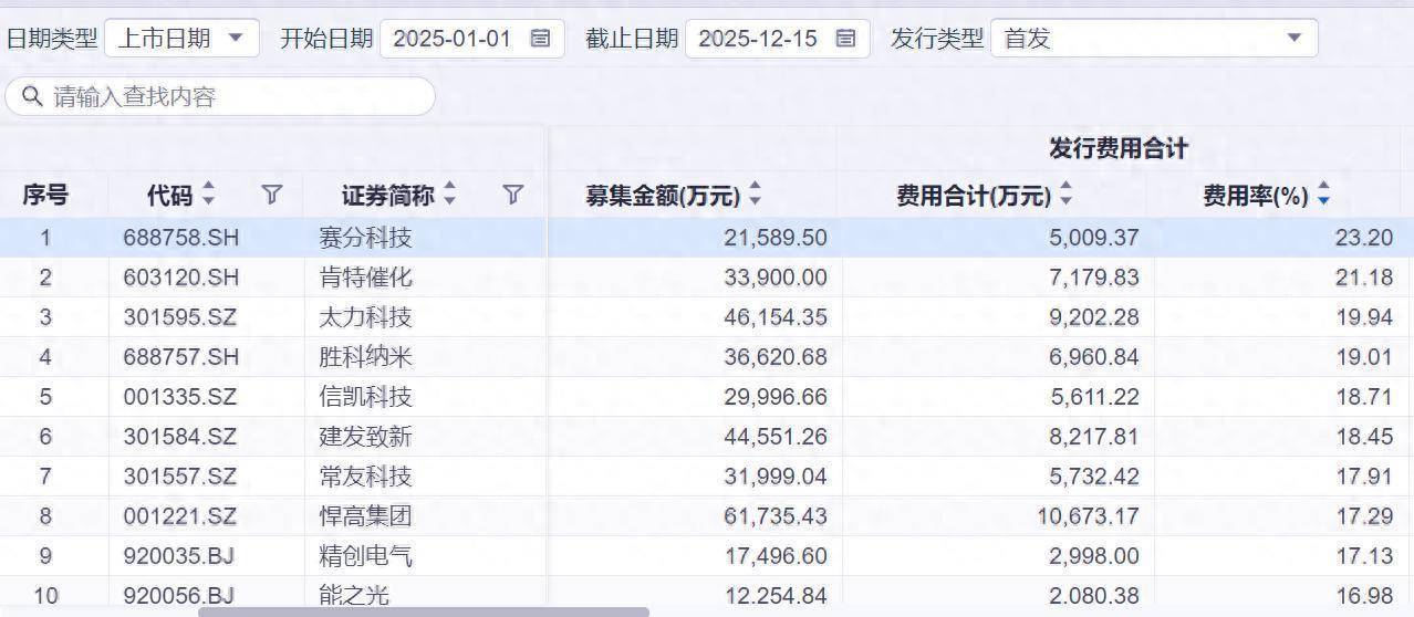 单家公司方面,科创板与主板各贡献一家费用率在20%以上的企业,其中赛分科技以23.2%的费用率高居榜首——根据数据,赛分科技首发募资额接近2.16亿元,发行费用合计5009.37万元。