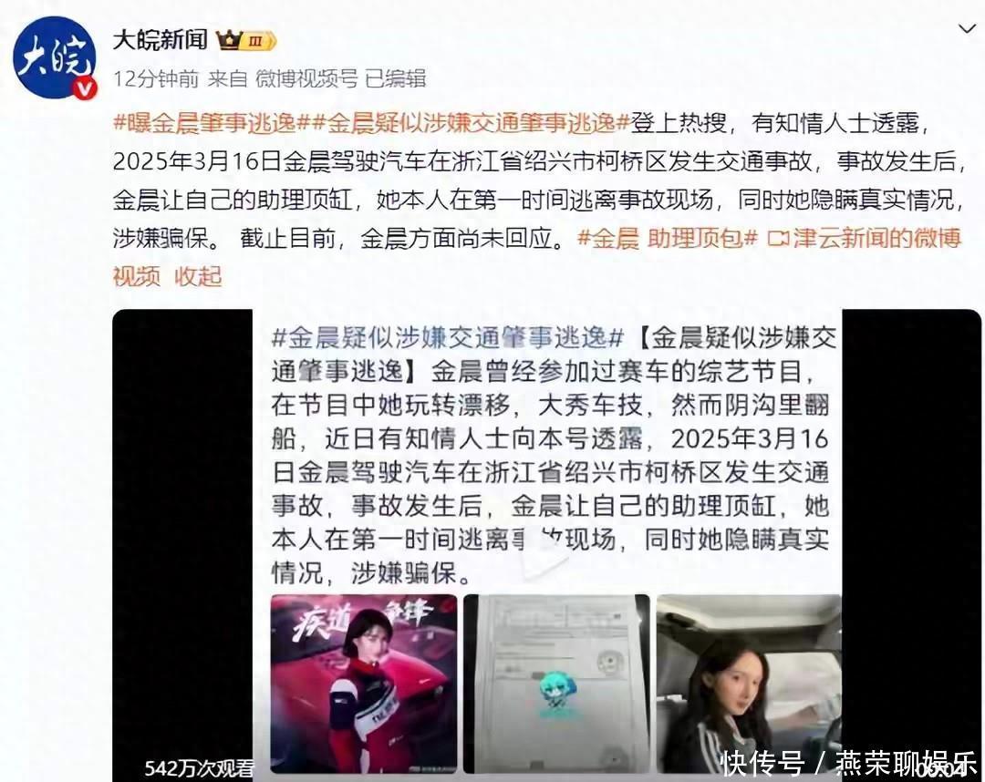 演艺圈再起波澜。2026年1月29日,一则“金晨涉嫌交通肇事逃逸”的消息登上热搜,引发舆论哗然。据知情人士透露,早在2025年3月16日,浙江省绍兴市柯桥区湖塘街道岭下村附近曾发生一起交通事故。现场处理时,自称驾驶员的助理徐长青承担了责任,车主金晨与其经纪人却已悄然离开。
