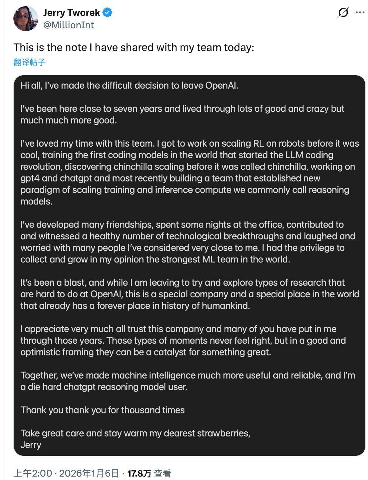 凤凰网科技讯 北京时间1月6日,据科技网站TheVerge报道,OpenAI研究副总裁杰里·托雷克(Jerry Tworek)周一宣布离职,他已在公司任职近7年。